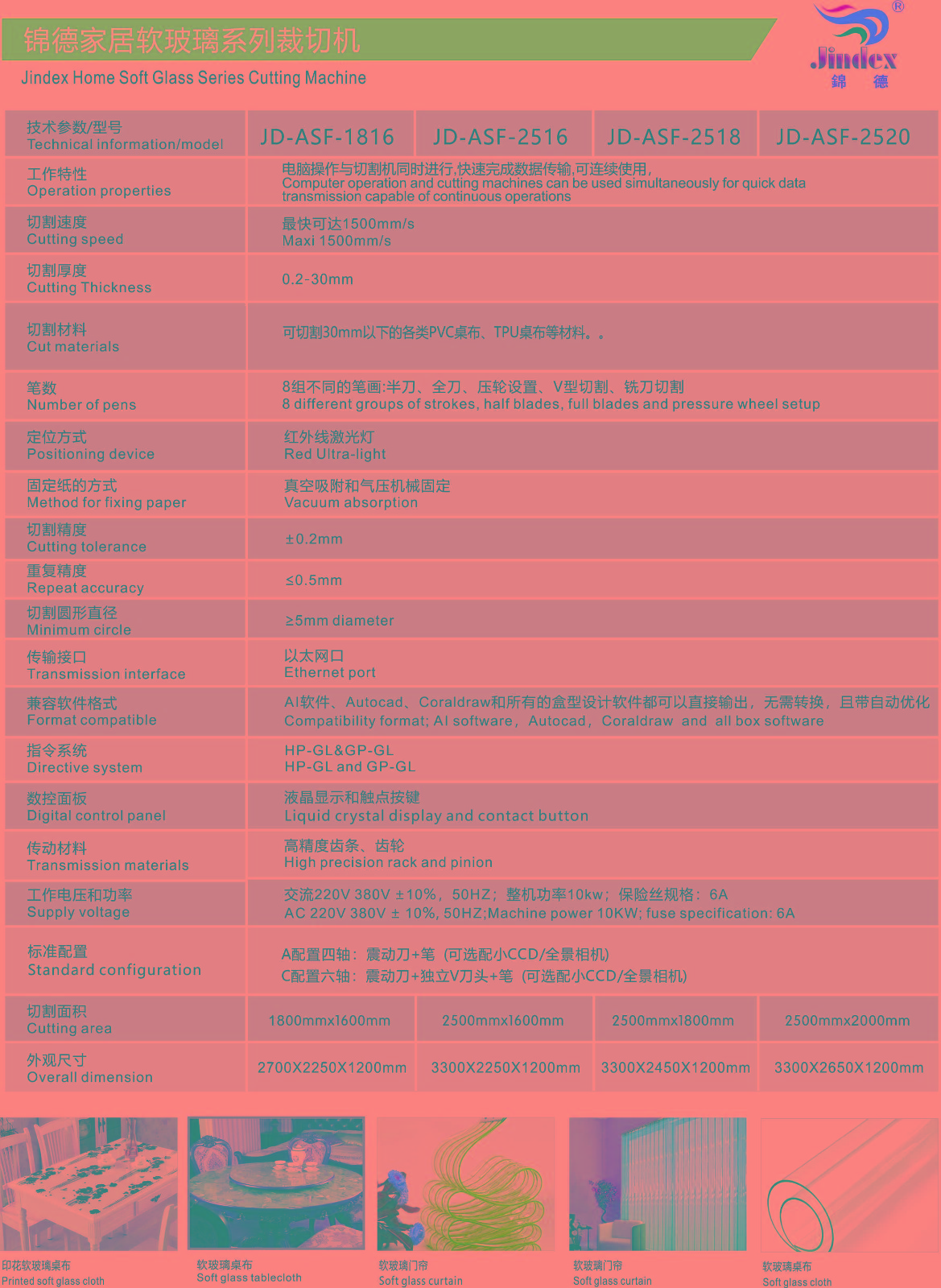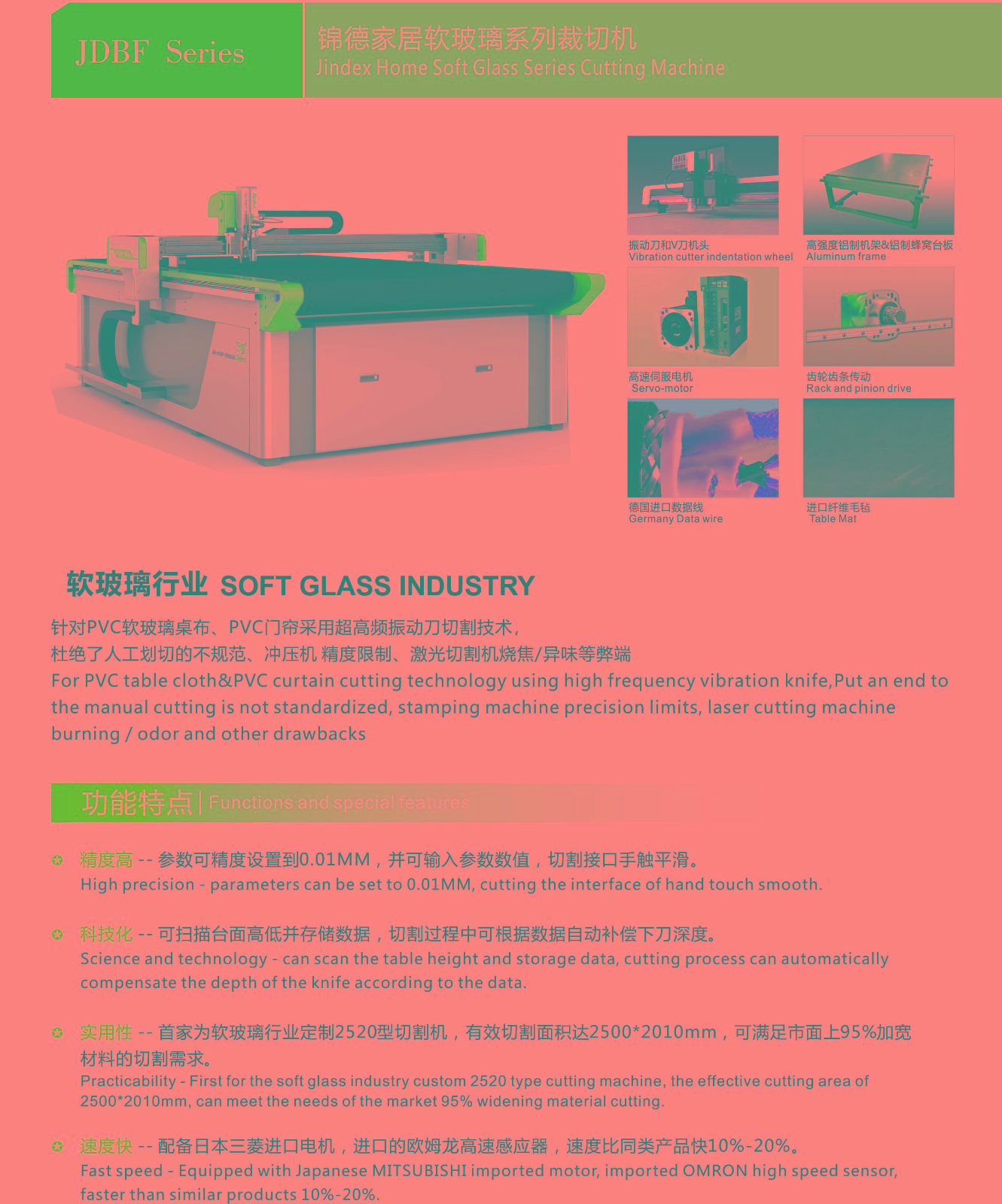 錦德振動刀自動裁剪機,裁剪效率高,相比人工快5倍左右,相比激光快2倍左右;裁剪精度高,誤差小于0.02mm;高度鎢鋼刀片切割,可以裁剪任意異形材料;智能排版系統(tǒng),節(jié)省材料10%以上;環(huán)保無污染,響應(yīng)國家綠色生產(chǎn)的號召。 玻璃=pvc軟質(zhì)水晶板在工業(yè)、家庭使用的都很廣泛,pvc軟玻璃的特點:耐熱、耐寒、耐光照、抗靜電、抗老化、耐重壓、耐強酸堿、透光性好、使用壽命長、不變形、不發(fā)碎、不發(fā)硬、高彈性、無毒無味等等!